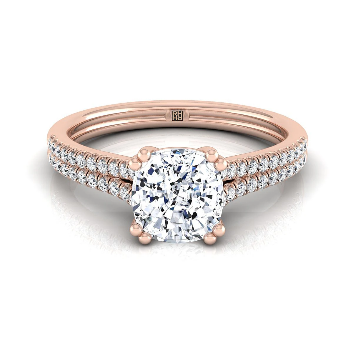 14K Rose Gold Cushion Diamond Double Row Double Prong French Pave Engagement Ring -1/6ctw