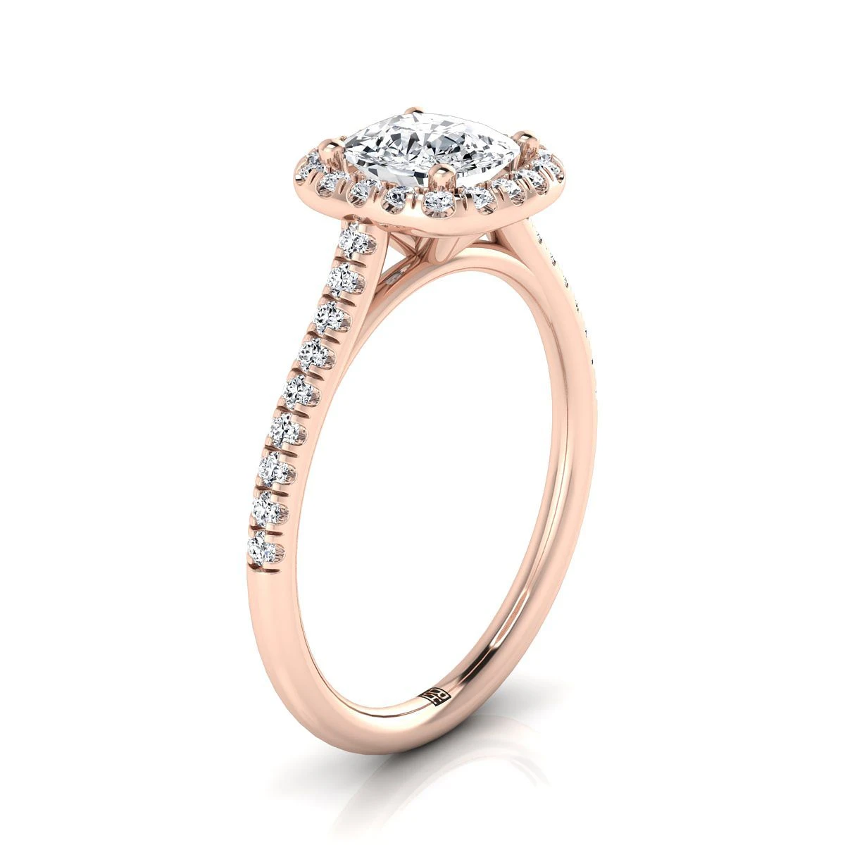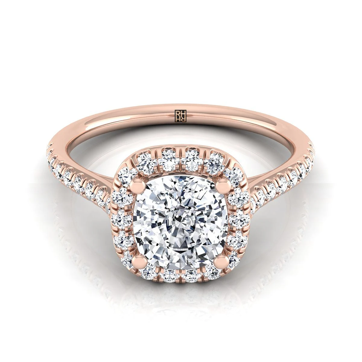 An Elegant Statement Of Style, This Cushion Cut Halo Engagement Ring With Diamond Pave Shank Showcases Brilliant Cut Diamonds (h-i/vs 0.33ctw) Beautifully Set In A Classic 14k Rose Gold Setting.
