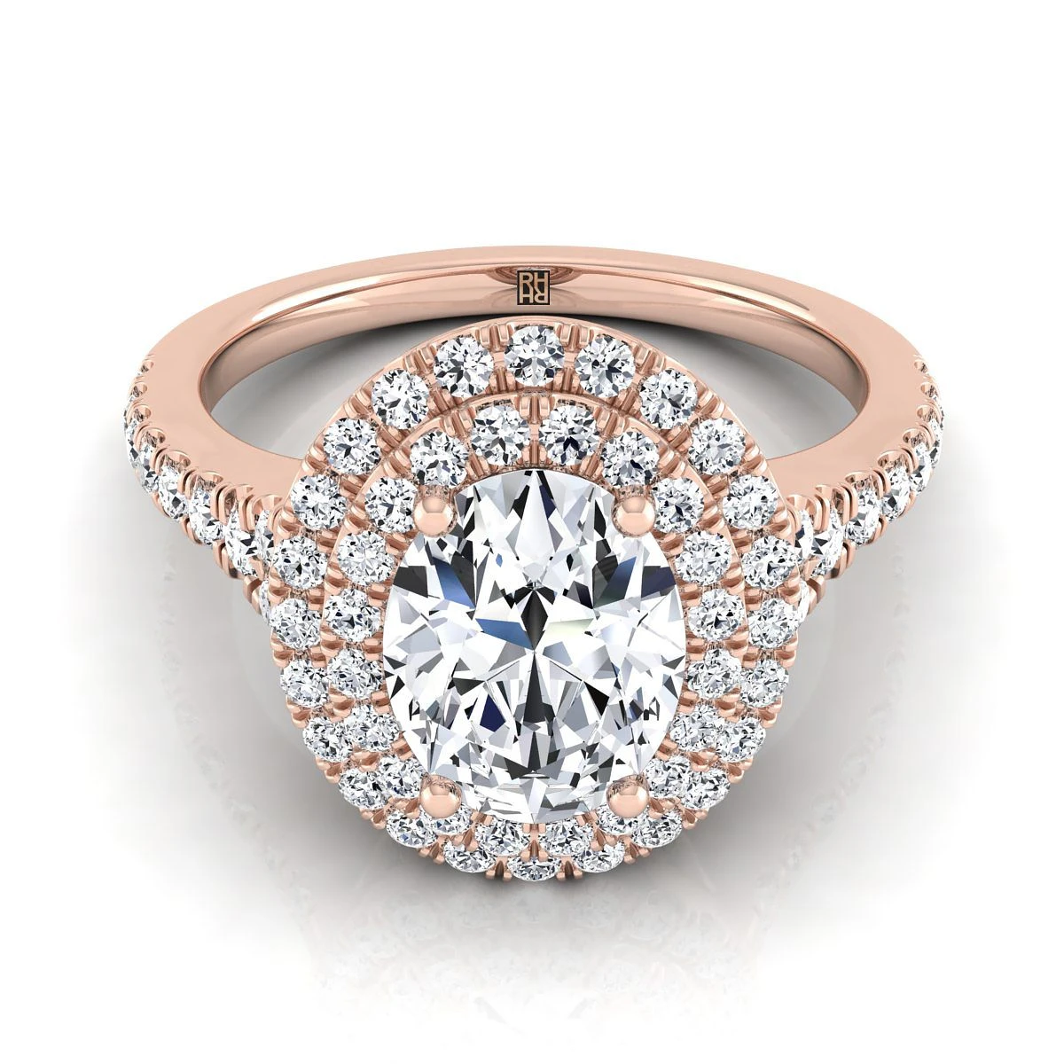 14K Rose Gold Oval Diamond Double Halo Scalloped Pavé Engagement Ring -1/2ctw