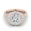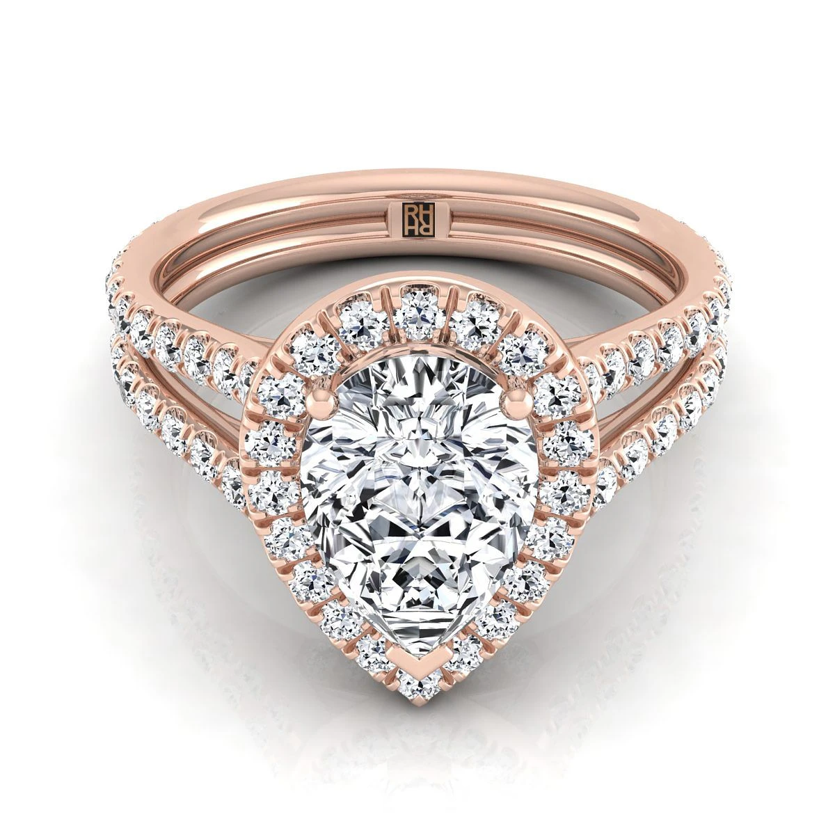 14K Rose Gold Pear Shape Center Diamond Halo Two Row Pavé Split Shank Engagement Ring -7/8ctw