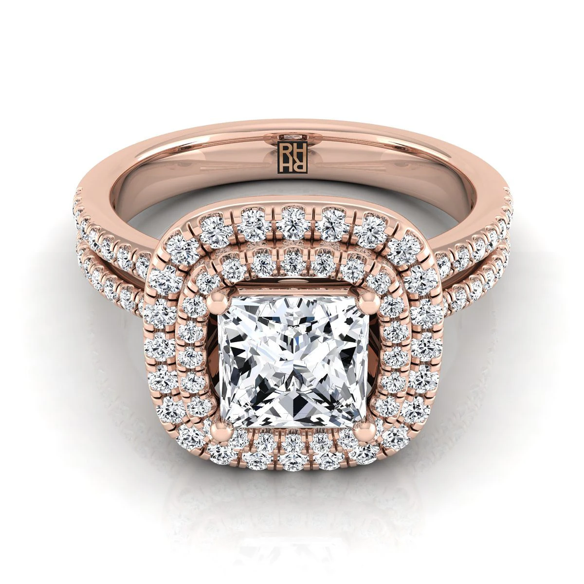 Exquisitely Handcrafted, This Double Pave Halo Princess Cut Engagement Ring Showcases Brilliant Cut Diamonds (h-i/vs 0.45ctw) Beautifully Pave Set In A Classic 14k Rose Gold Setting.