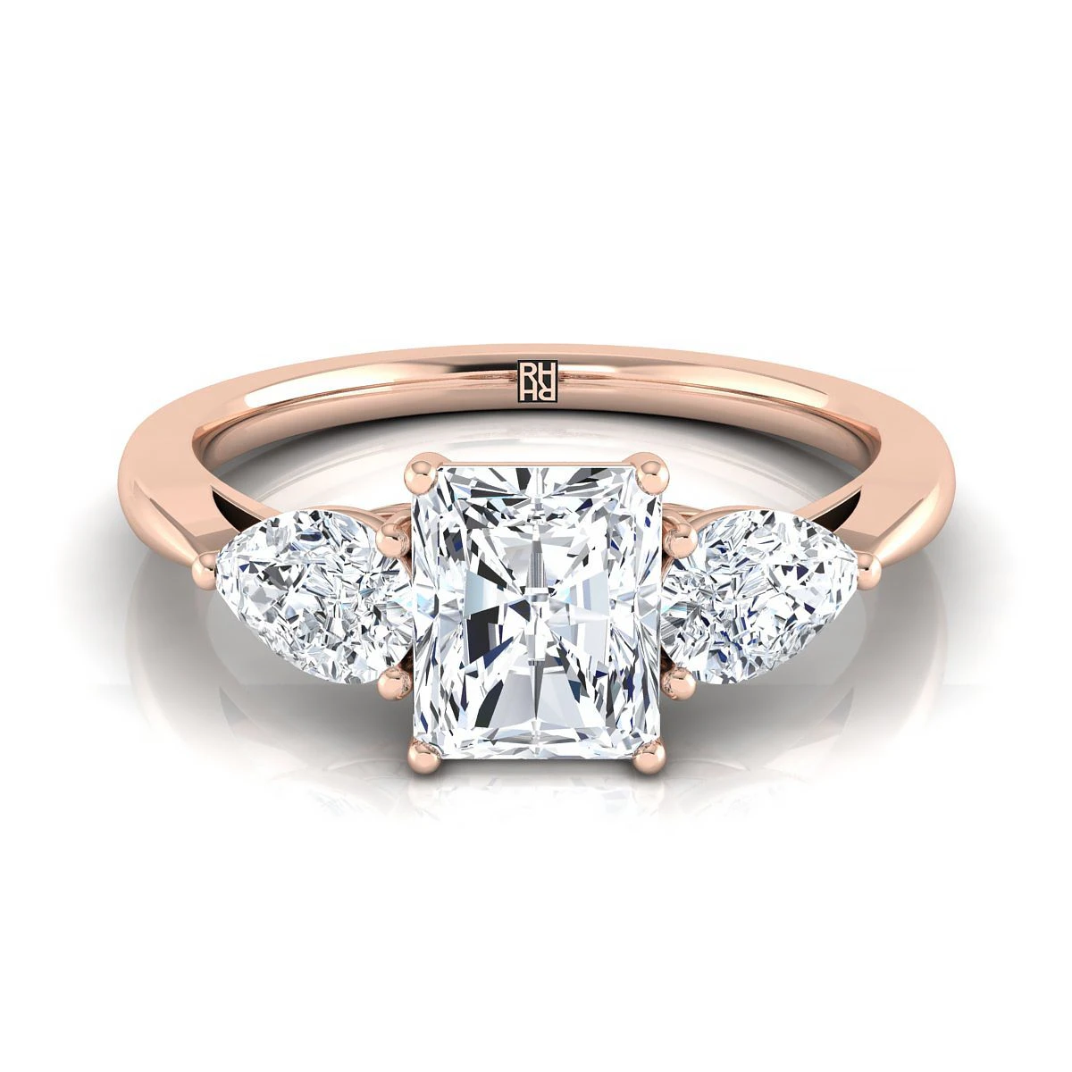 14K Rose Gold Radiant Cut Center Diamond Perfectly Matched Pear Shaped Three Diamond Engagement Ring -7/8ctw