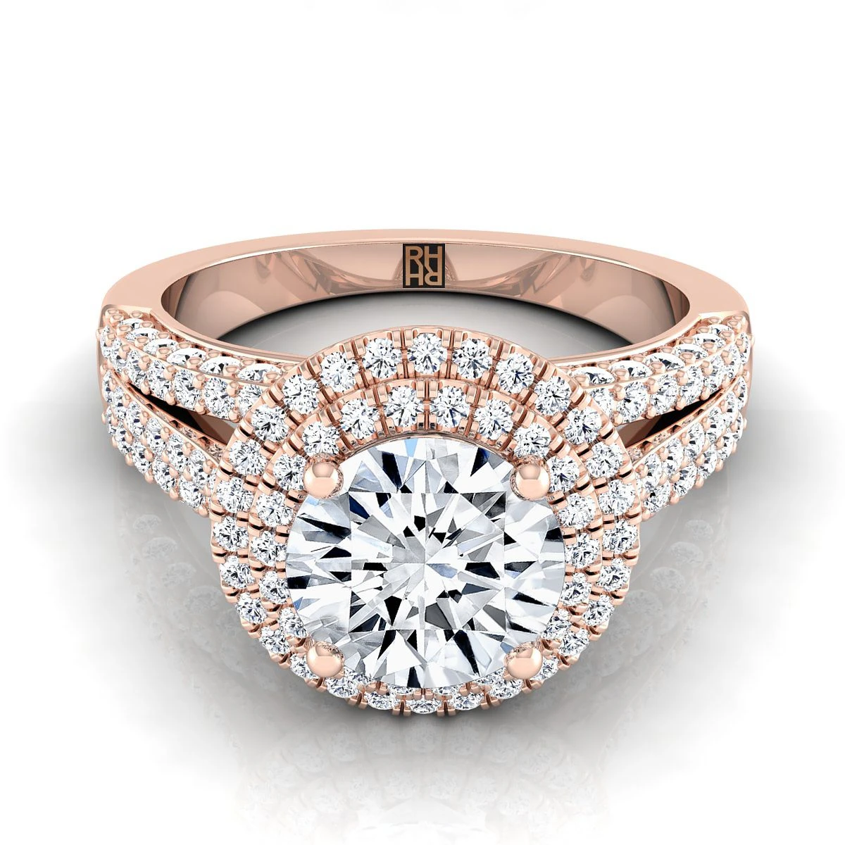 An Elegant Statement Of Style, This Double Round Halo Pave Engagement Ring Showcases Brilliant Cut Diamonds (h-i/vs 0.90ctw) With An Exquisite Pave Shank Mounted In A 14k Rose Gold Setting.