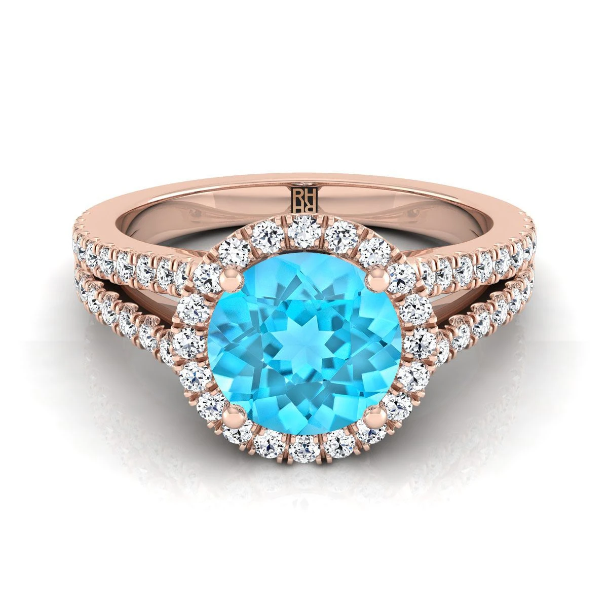 14K Rose Gold Round Brilliant Swiss Blue Topaz Halo Center With French Pave Split Shank Engagement Ring -3/8ctw
