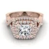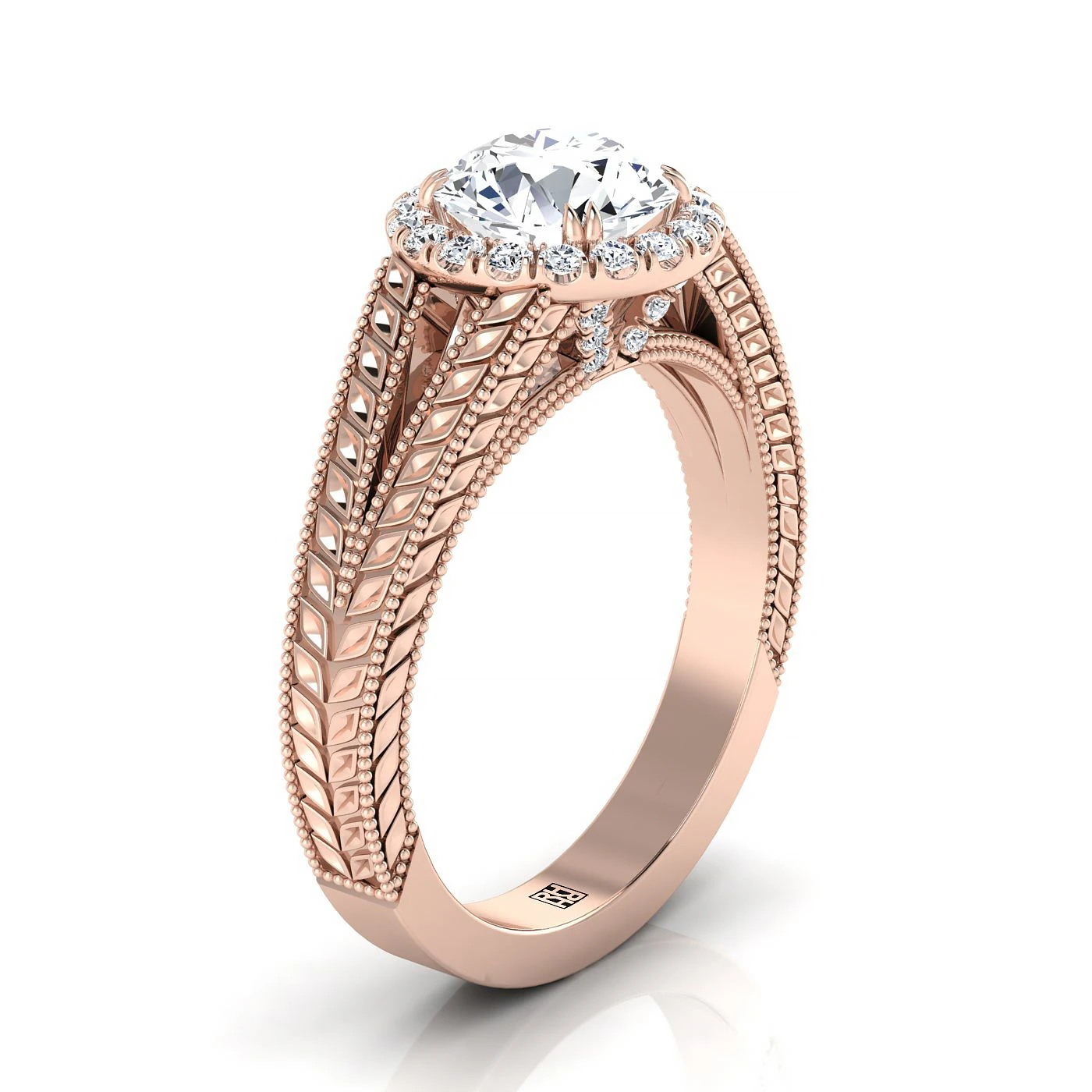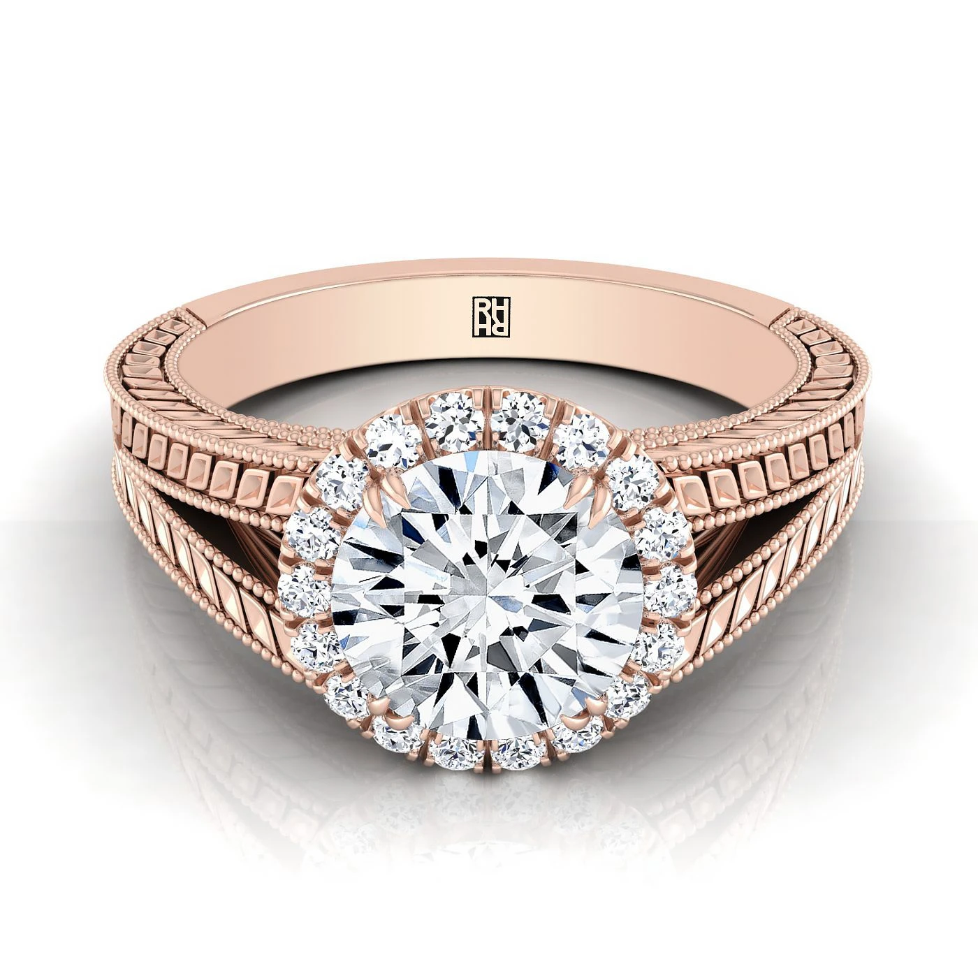 14K Rose Gold Round Brilliant Vintage Inspired Wheat Split Shank Diamond Halo Engagement Ring