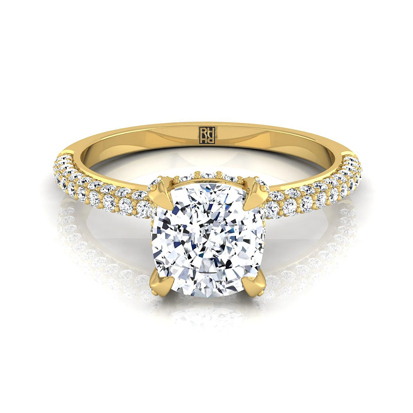 14K Yellow Gold Cushion Diamond Encrusted Claws And Triple Pave Engagement Ring -1/2ctw