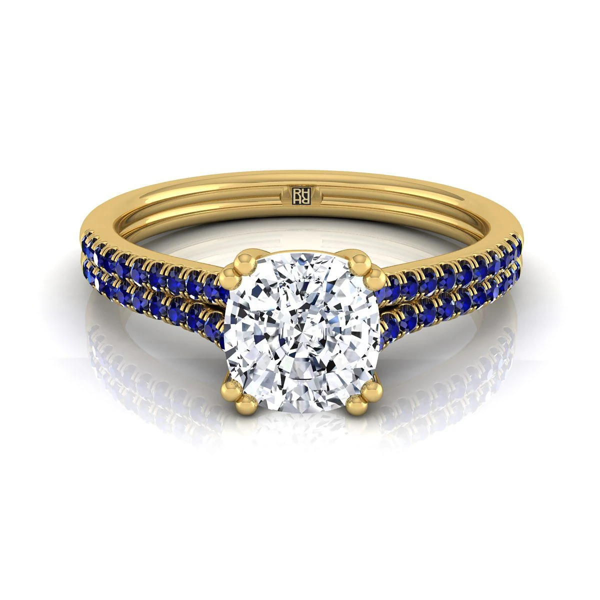 Exquisitely Handcrafted, This Cushion Cut Diamond Engagement Ring Showcases Round Sapphires Beautifully Micro U Pave Set In A Classic 14k Yellow Gold Setting.