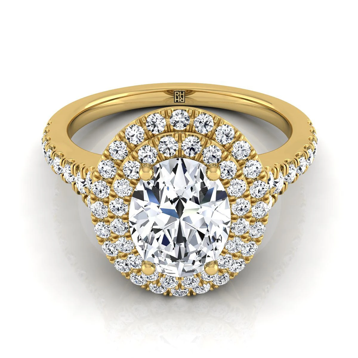 An Elegant Statement Of Style, This Double Halo Oval Pave Engagement Ring Showcases Brilliant Cut Diamonds (h-i/vs 0.55ctw) With An Exquisite Pave Shank Mounted In A 14k Yellow Gold Setting.