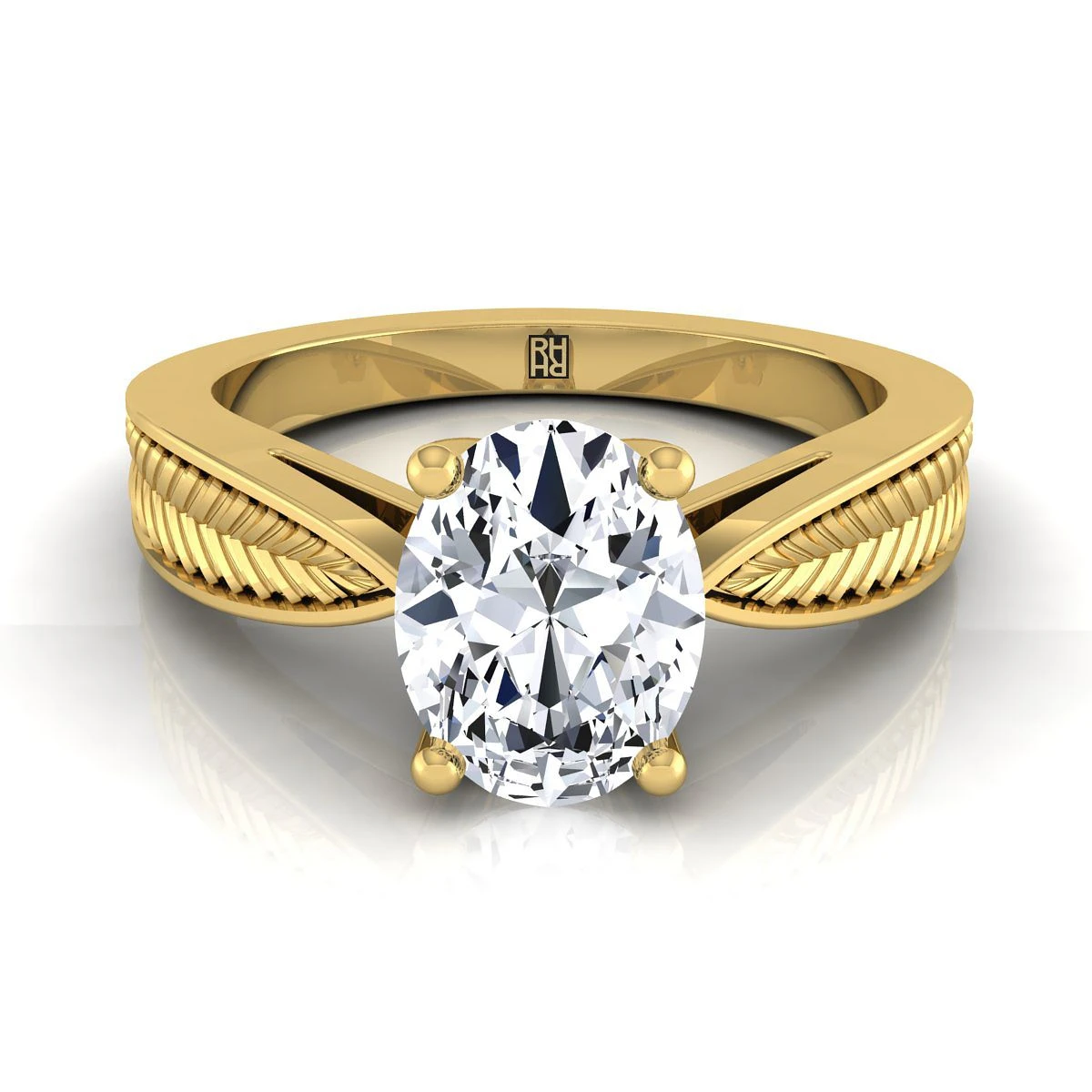 Bold And Elegant, This Oval Shape Diamond Solitaire Engagement Ring In 14k Yellow Gold Showcases An Exquisite Leaf Textured Shank. Includes 4 Prong Setting For 1.25ctw Center