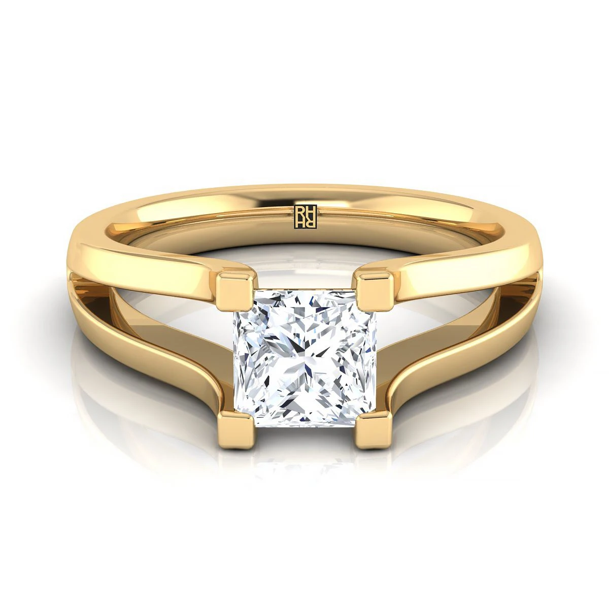 This Princess Cut Diamond Engagement Ring Showcases A High Polish Split Shank In 14k Yellow Gold