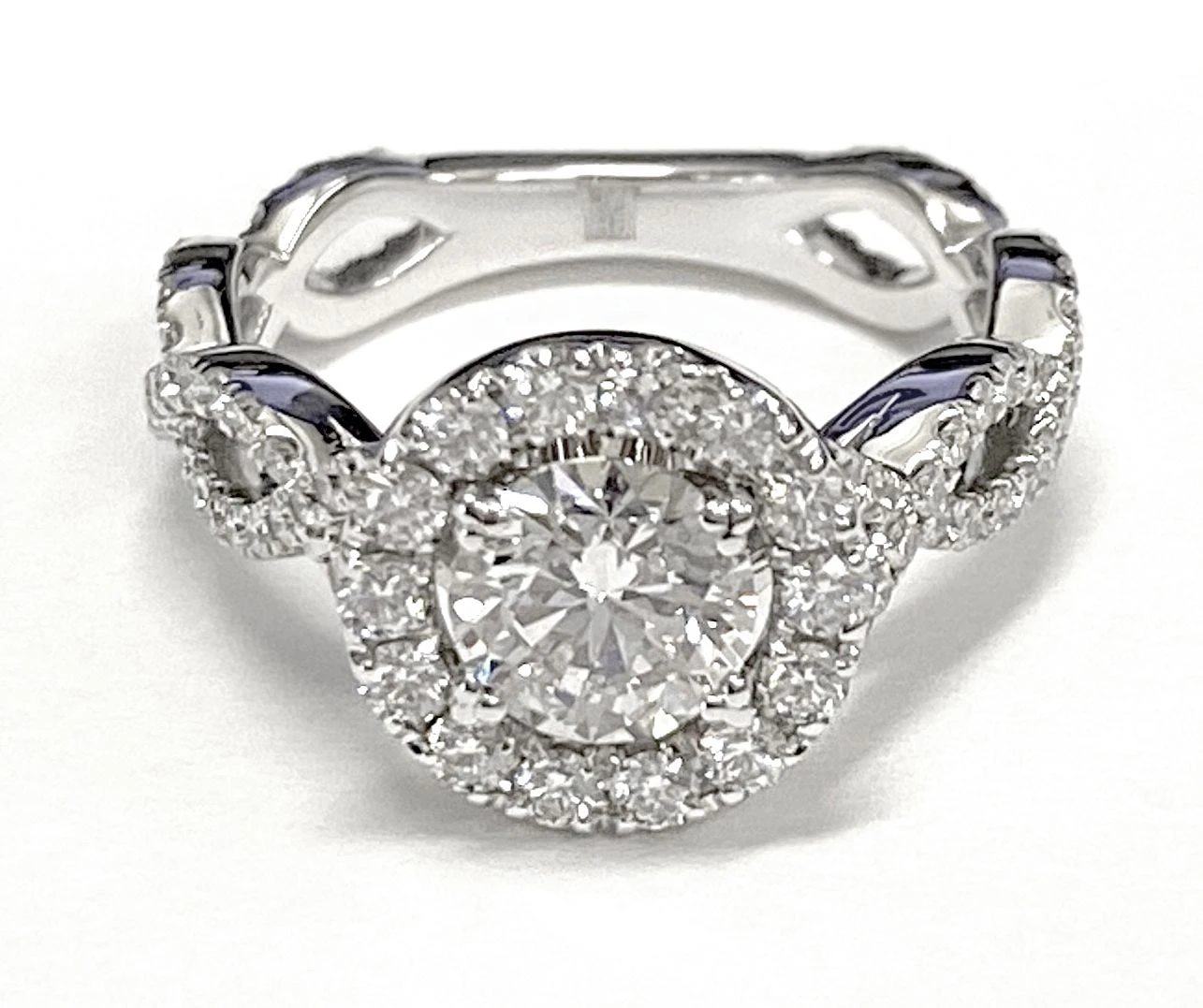Classic With A Bold Twist, This Halo Engagement Ring With Pave Ribbon Design Shank Showcases Brilliant Cut Diamonds (h-i/vs 0.80ctw) Beautifully Set In A Classic 14k Yellow Gold Setting.
