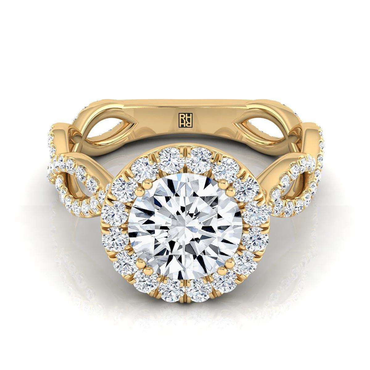 14K Yellow Gold Round Brilliant Diamond Ribbon Twist French Pave Halo Engagement Ring -3/4ctw