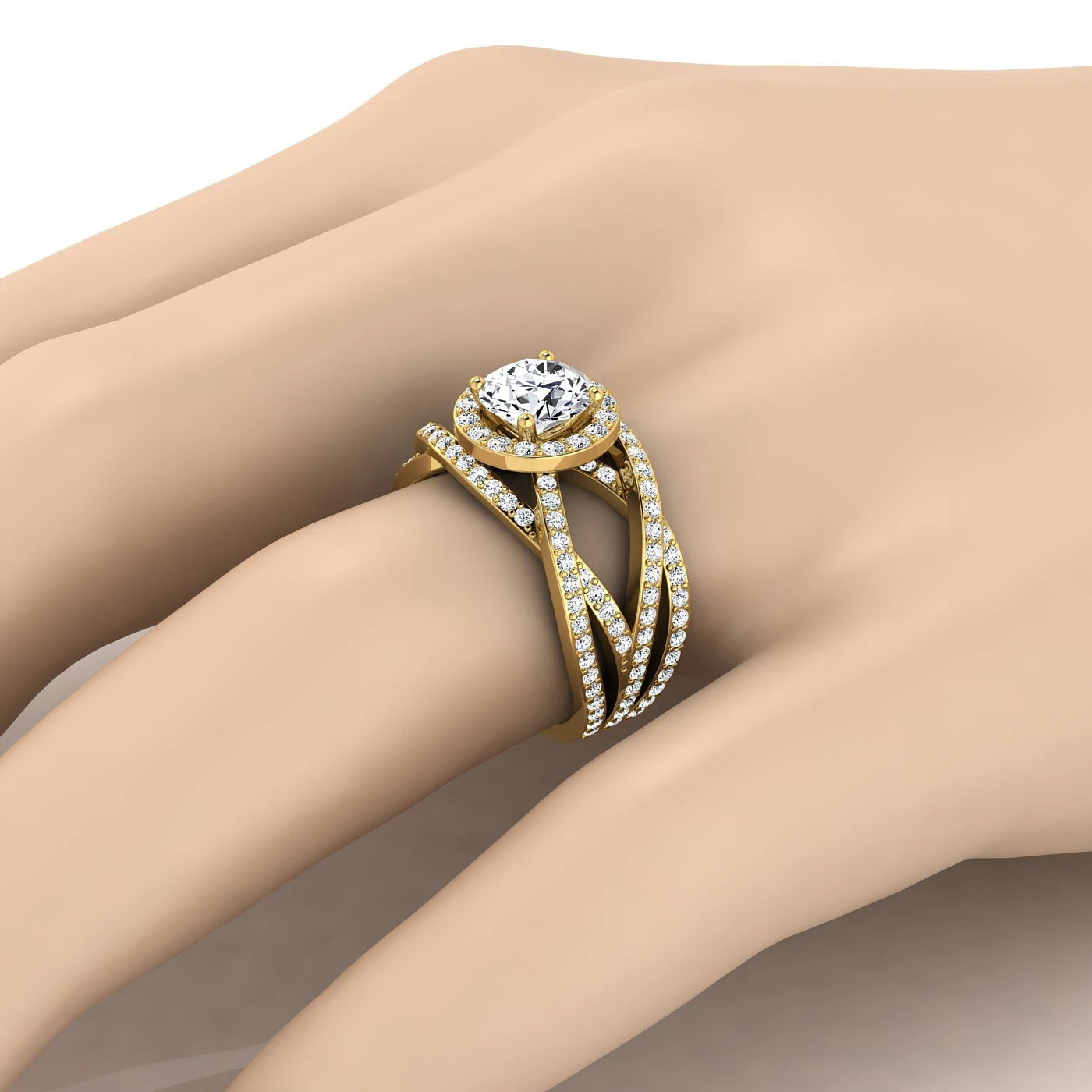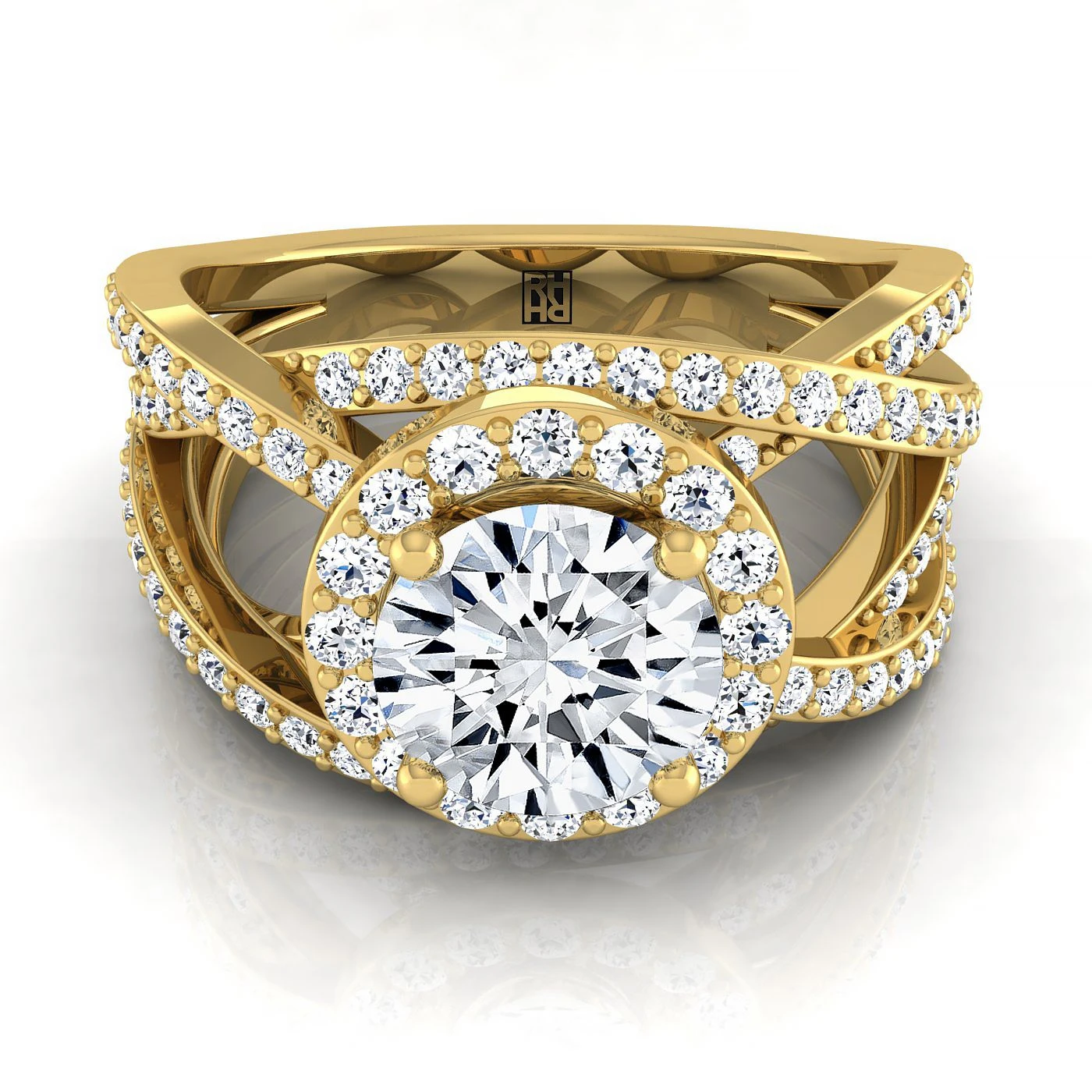 14K Yellow Gold Round Brilliant Unique Open Intertwined Diamond Pave Row Engagement Ring -1ctw