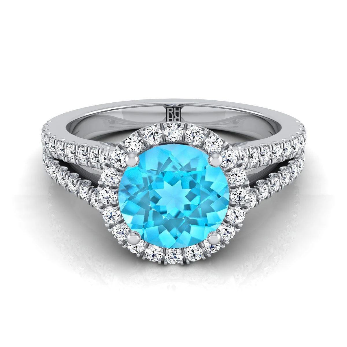 18K White Gold Round Brilliant Swiss Blue Topaz Halo Center With French Pave Split Shank Engagement Ring -3/8ctw