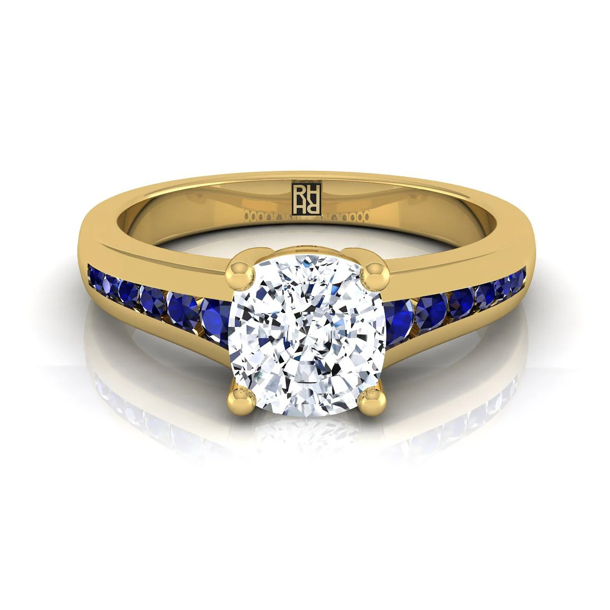 18K Yellow Gold Cushion Contemporary Tapered Blue Sapphire Channel Engagement Ring