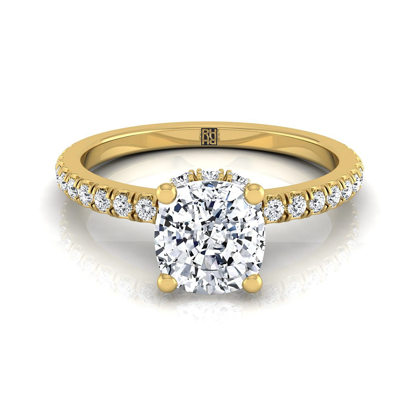 An Elegant Statement Of Style, This Cushion Cut Petite Split Prong Engagement Ring Showcases Brilliant Cut Diamonds (h-i/vs 0.29ctw) Beautifully Prong Set In 18k Yellow Gold.