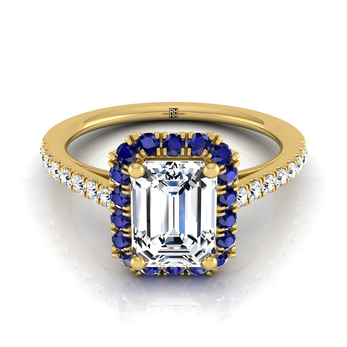Exquisitely Handcrafted, This Emerald Cut Diamond Engagement Ring Showcases Brilliant Cut Diamonds (h-i/vs 0.20ctw) And Round Sapphires Beautifully Set In A Classic 18k Yellow Gold Setting.