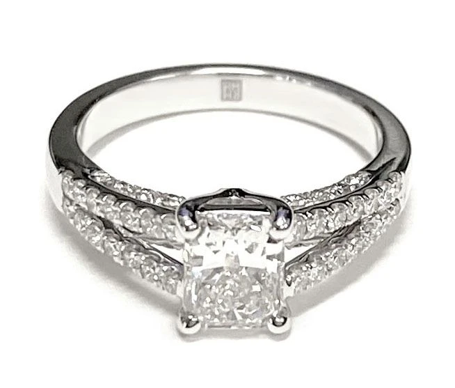 An Elegant Statement Of Style, This Radiant Cut Diamond Engagement Ring With Split Pave Shank Showcases Brilliant Cut Diamonds (h-i/vs 0.33ctw) Set In A 18k Yellow Gold Setting.