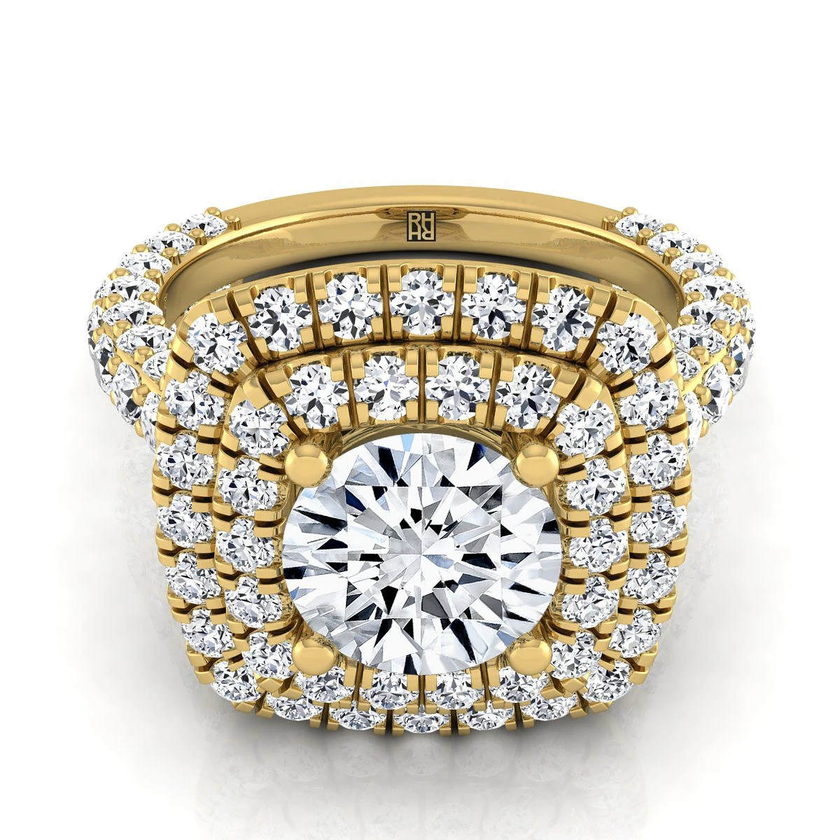 18K Yellow Gold Round Brilliant Diamond Bold And Fancy Double Halo French Pave Engagement Ring -2ctw