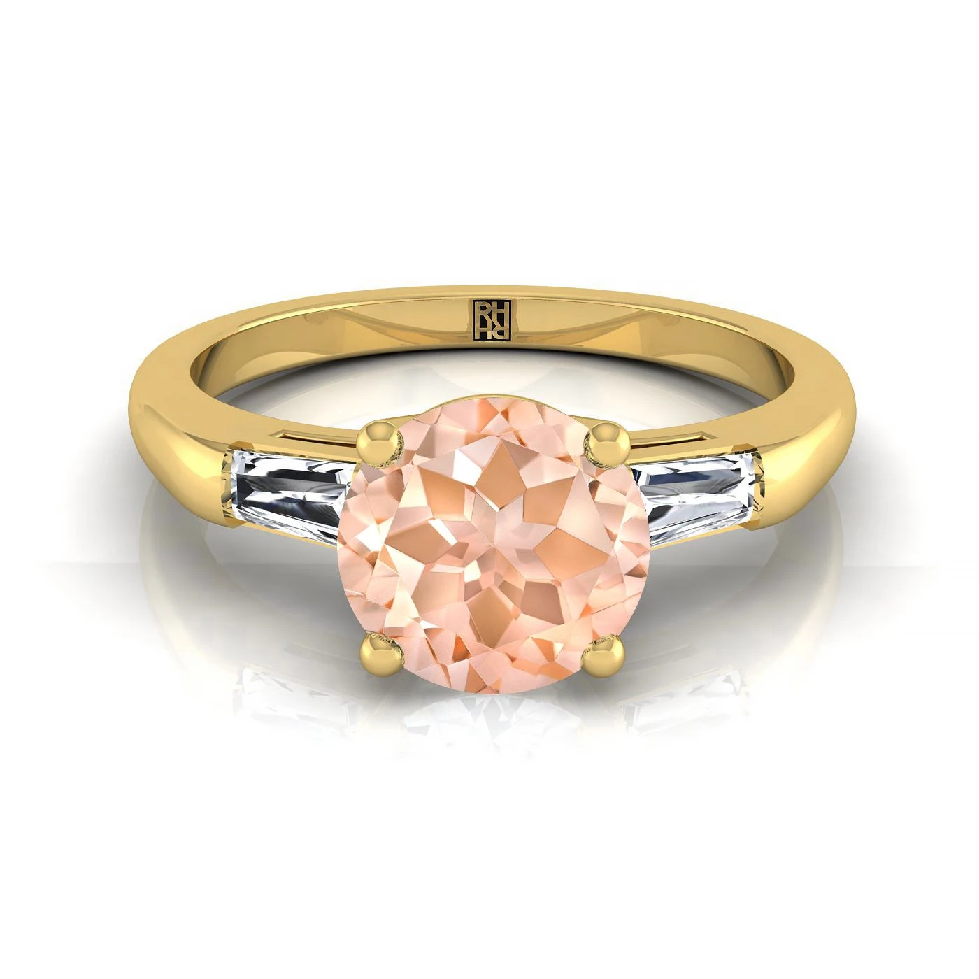 18k Yellow Gold Engagement Ring With 5 Mm Round Morganite Center Stone And 2 Tapered Baguettes Weighing 0.18ctw