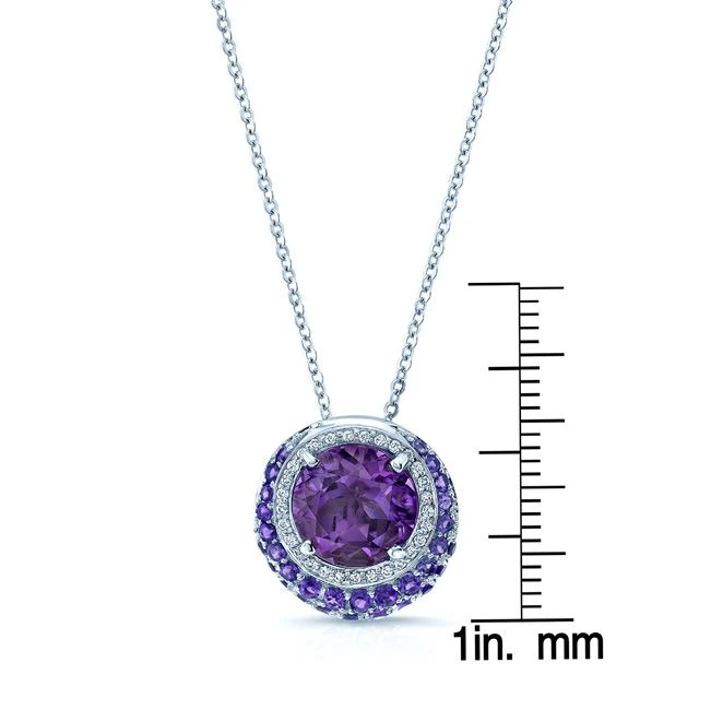 14k White Gold Pendant With 1 Round Amethyst Measuring 8mm (1.75ct), 30 Round Amethysts Weighing 0.33 Carats And 29 Round Brilliant Diamonds Weighing 0.15 Carats On A 17 Inch Rolo Chain