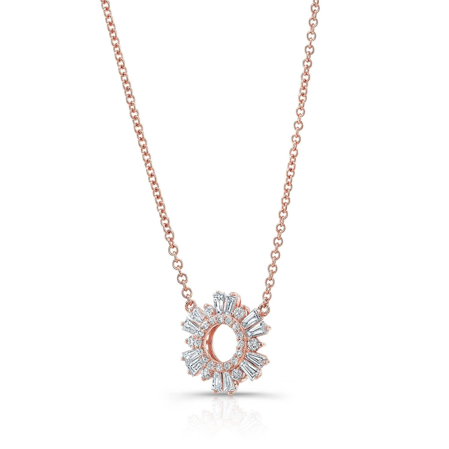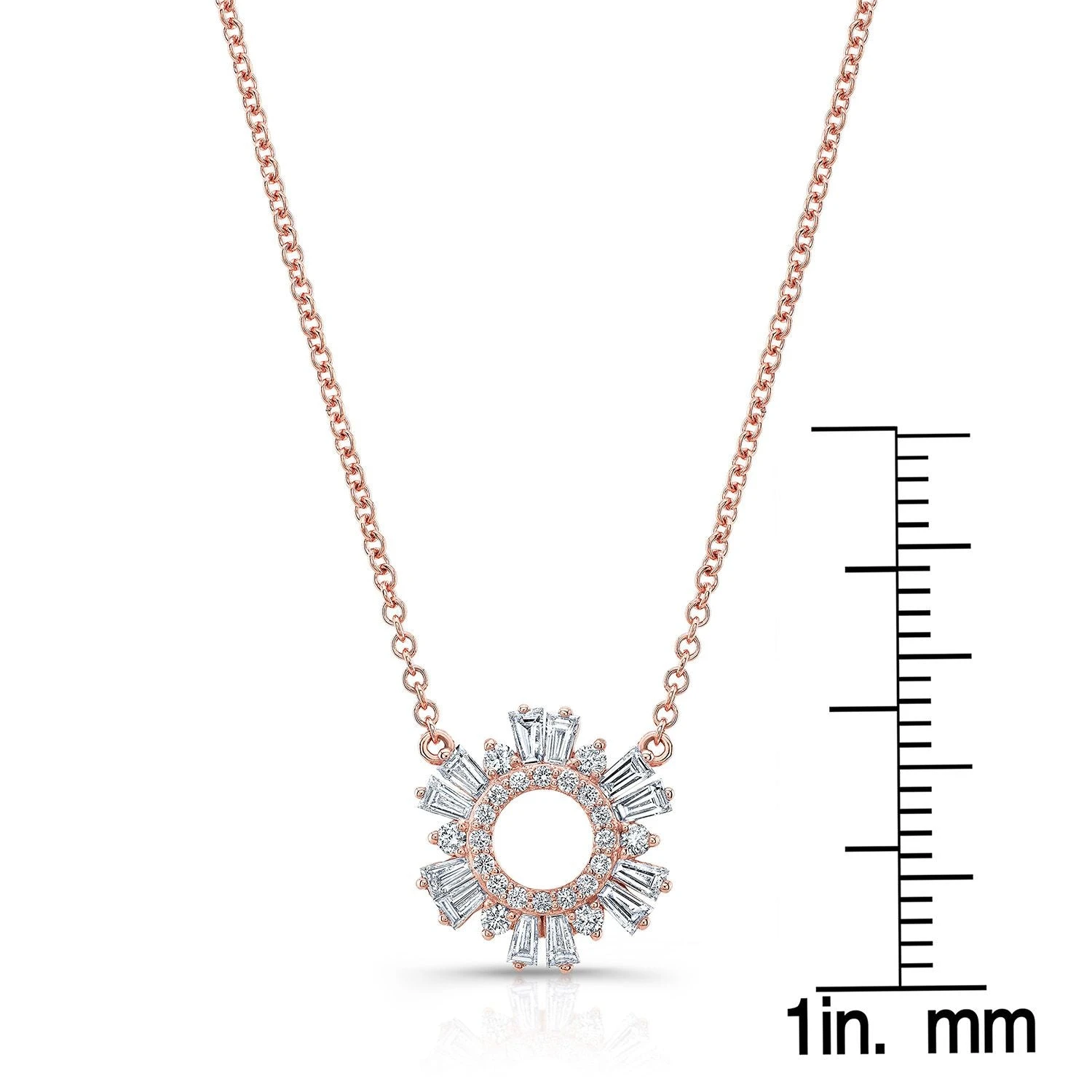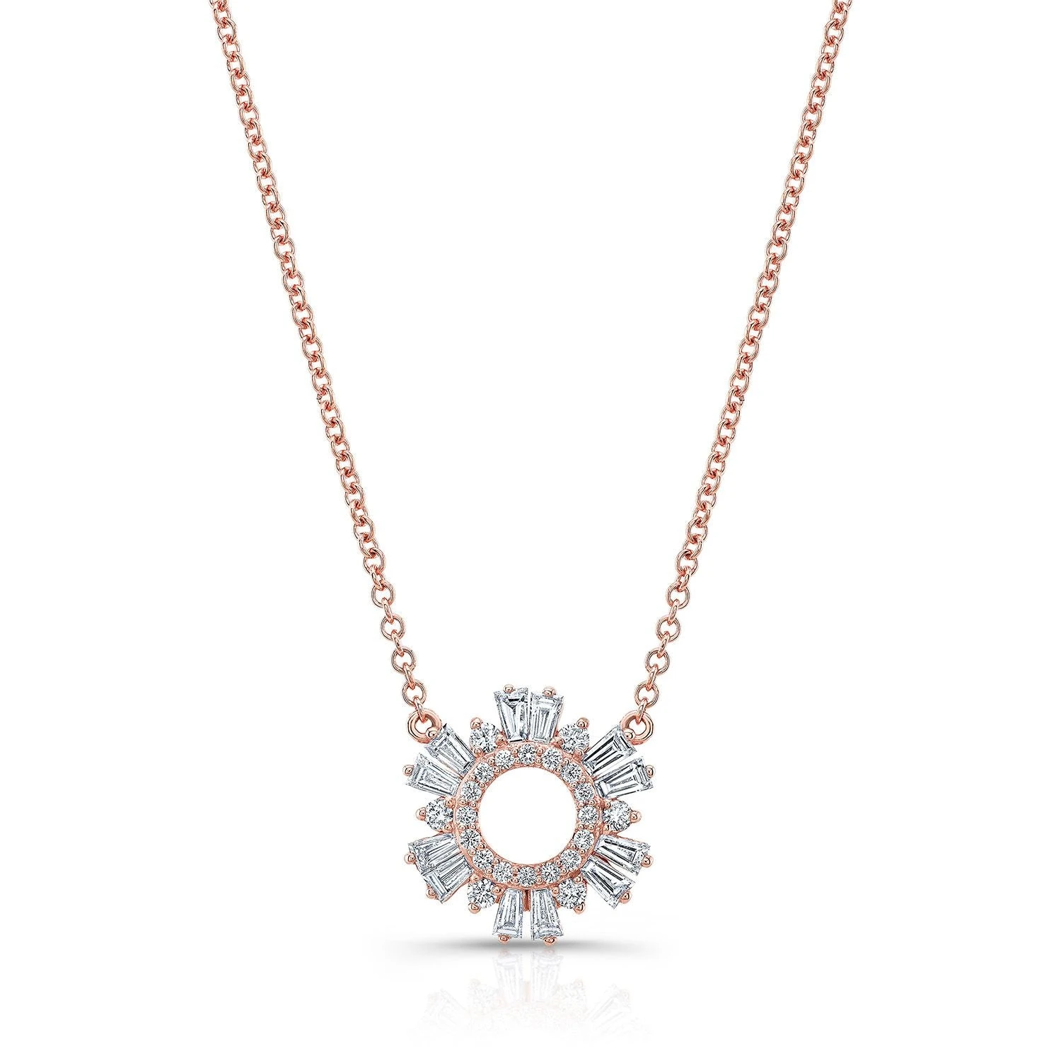 Diamond Pave Circle And Tapered Baguette Starburst Necklace In 14k Rose Gold