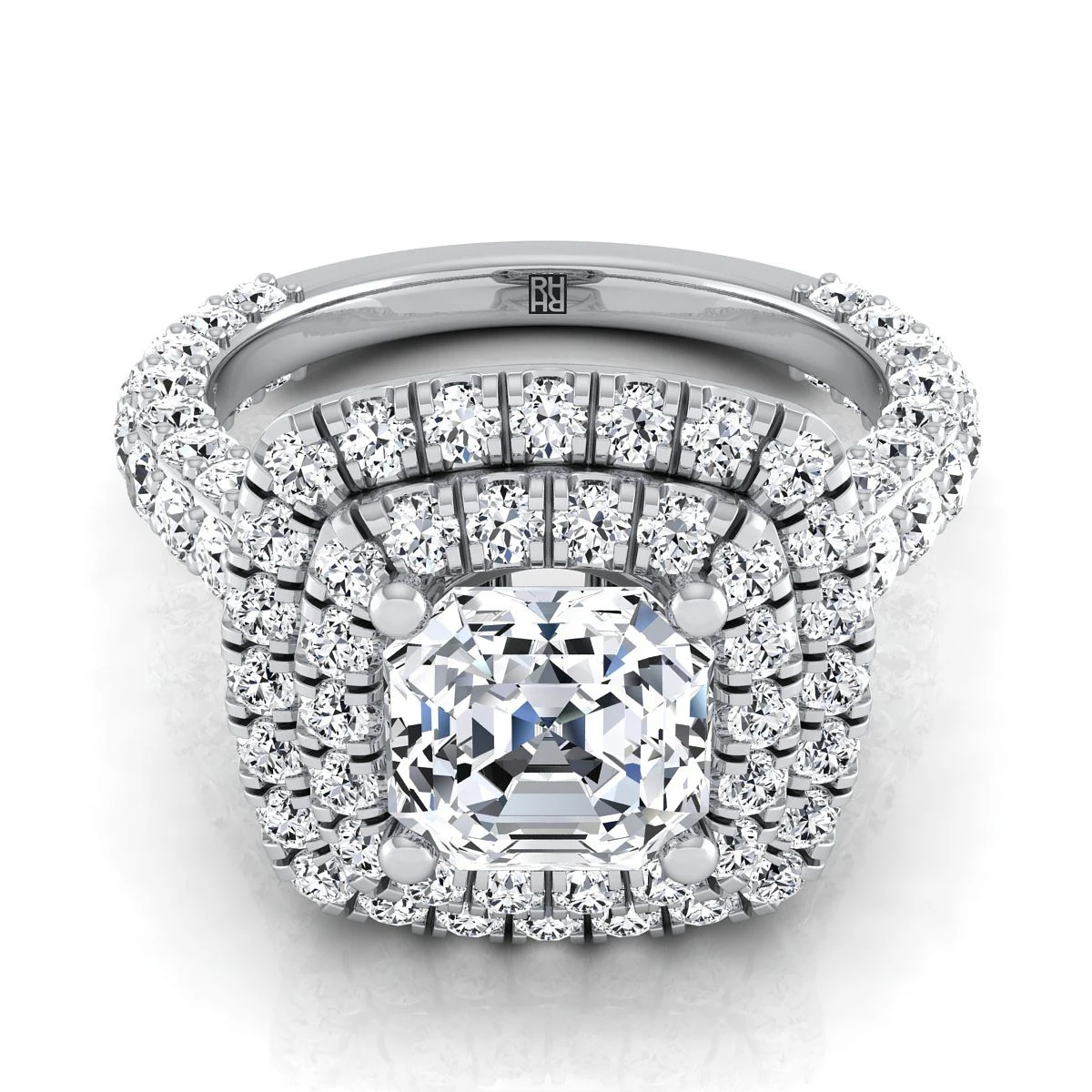 Platinum Asscher Cut Diamond Bold And Fancy Double Halo French Pave Engagement Ring -2ctw
