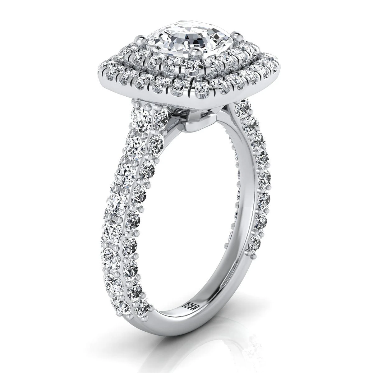 An Elegant Statement Of Style, This Asscher Cut Double Halo Pave Engagement Ring Showcases Brilliant Cut Diamonds (h-i/vs 2.15ctw) With An Exquisite Pave Shank Mounted In A Platinum Setting.