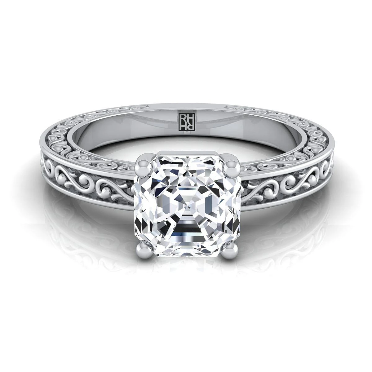 Platinum Asscher Cut Hand Engraved Scroll Vintage Solitaire Engagement Ring