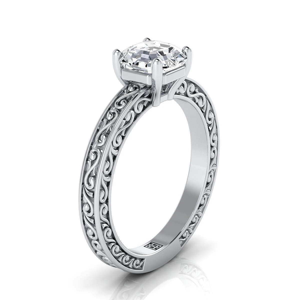 Understated Elegance, This Asscher Cut Diamond Engagement Ring Showcases A Scroll Engraved Design Shank With A Classic High Polish Finish In Platinum