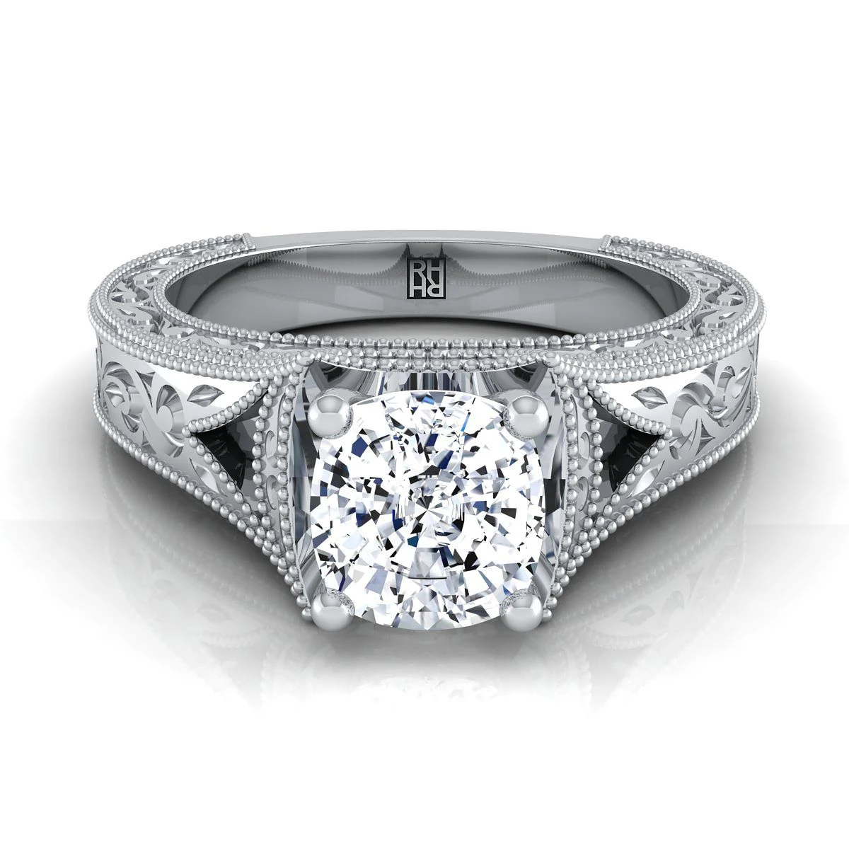 Platinum CushionHand Engraved And Milgrain Vintage Solitaire Engagement Ring