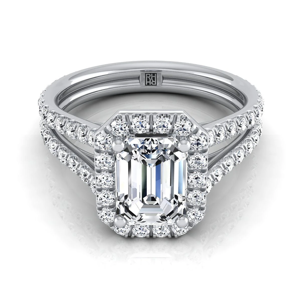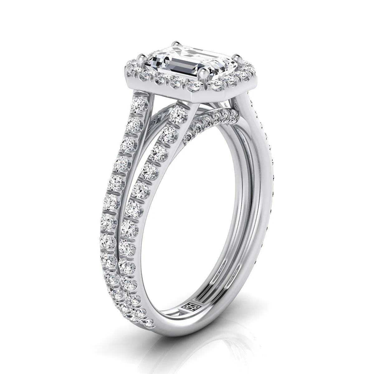Platinum Emerald Cut Diamond Halo Two Row Pavé Split Shank Engagement Ring -7/8ctw