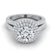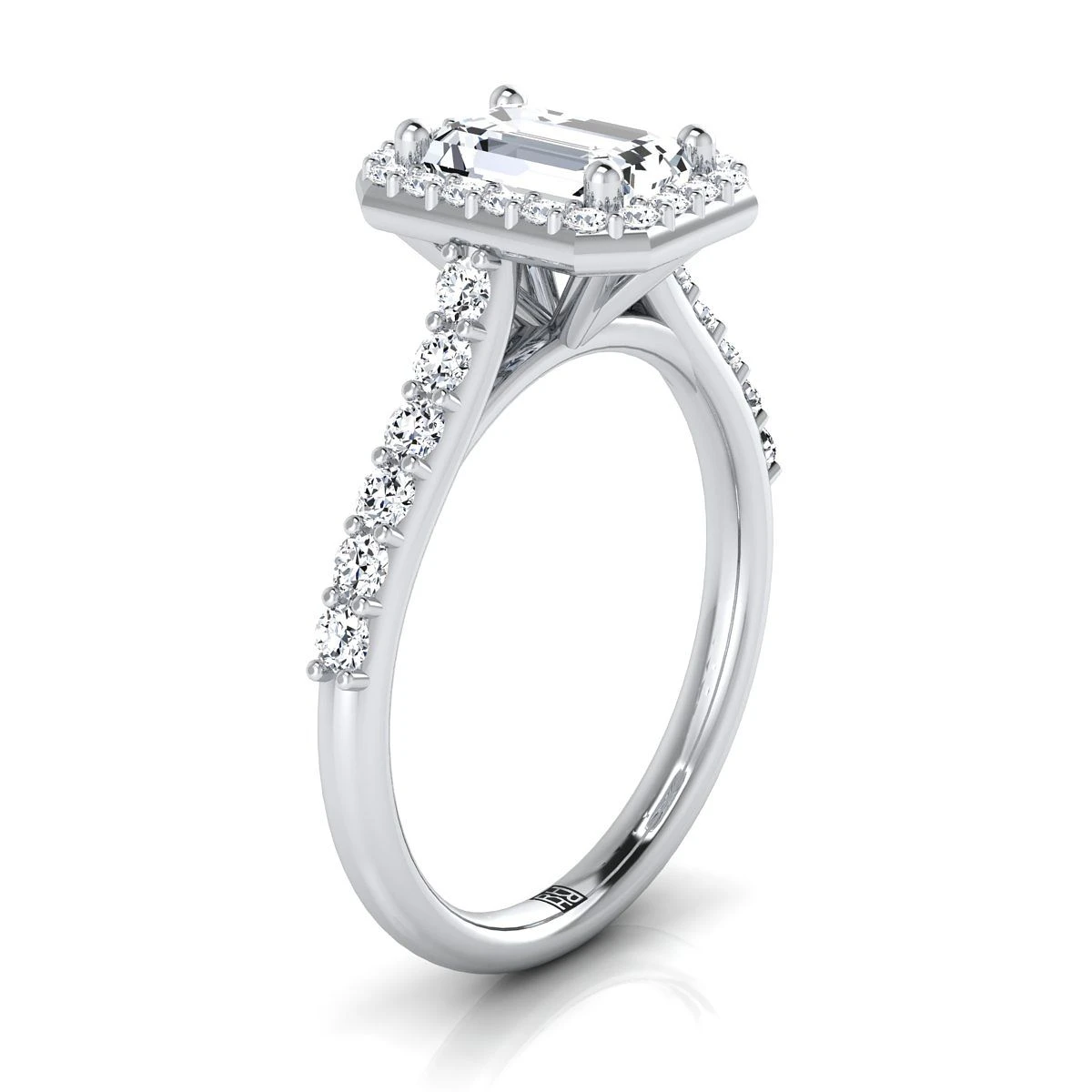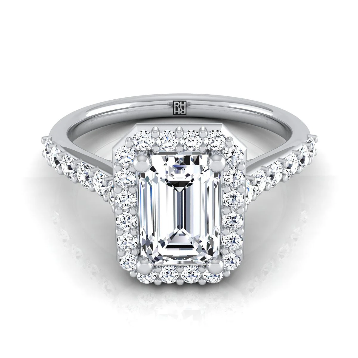 Platinum Emerald Cut Diamond Shared Prong Halo With French Pave Engagement Ring -1/2ctw