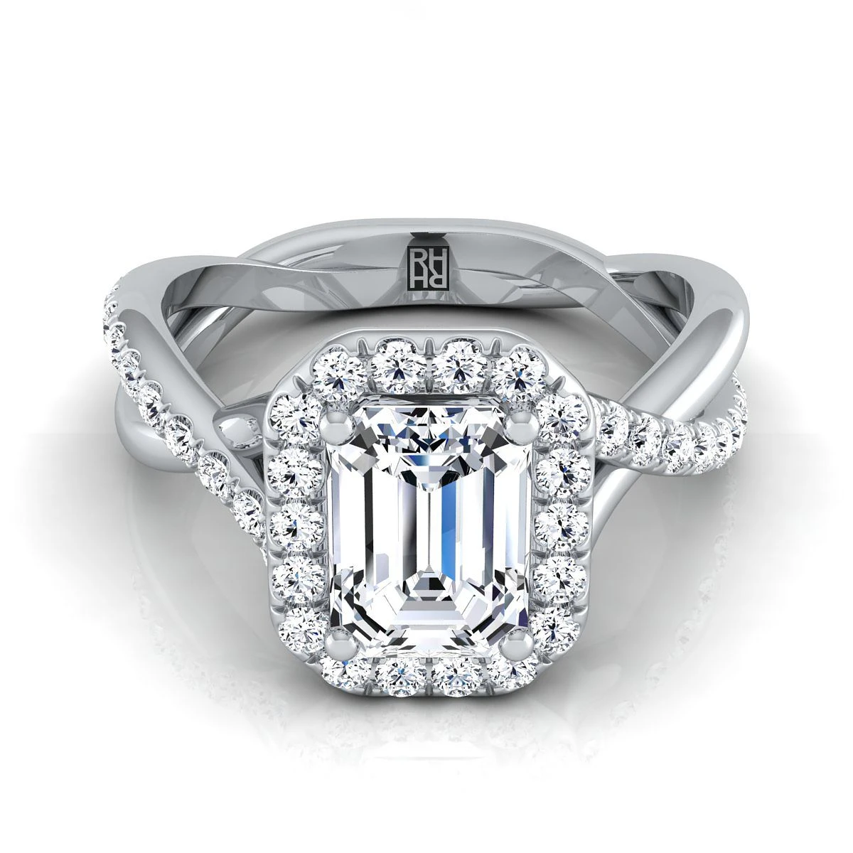 A Modern Statement Of Style, This Emerald Cut Halo Pave Engagement Ring With Infinity Shank Showcases Brilliant Cut Diamonds (h-i/vs 0.45ctw) Mounted In A Platinum Setting.