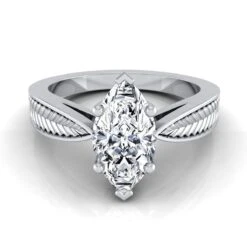 Bold And Elegant, This Marquise Diamond Solitaire Engagement Ring In Platinum Showcases An Exquisite Leaf Textured Shank. Includes 6 Prong Setting For 1.25ctw Center